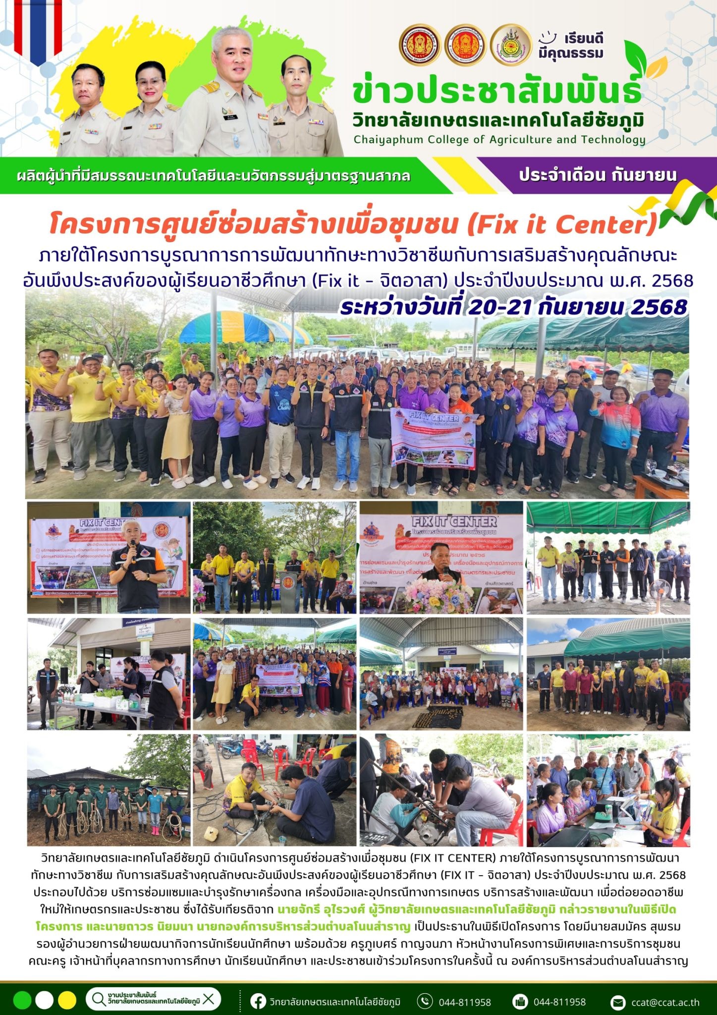 โครงการศูนย์ซ่อมสร้างเพื่อชุมชน (Fix it Center) ภายใต้โครงการบูรณาการการพัฒนาทักษะทางวิชาชีพกับการเสริมสร้างคุณลักษณะ อันพึงประสงค์ของผู้เรียนอาชีวศึกษา (Fix it – จิตอาสา) ประจำปีงบประมาณ พ.ศ. 2568 22 ก.ย. 256823 ก.ย. 2025admin siteกิจกรรมภายใน รับชมรูปภาพเพิ่มเติม