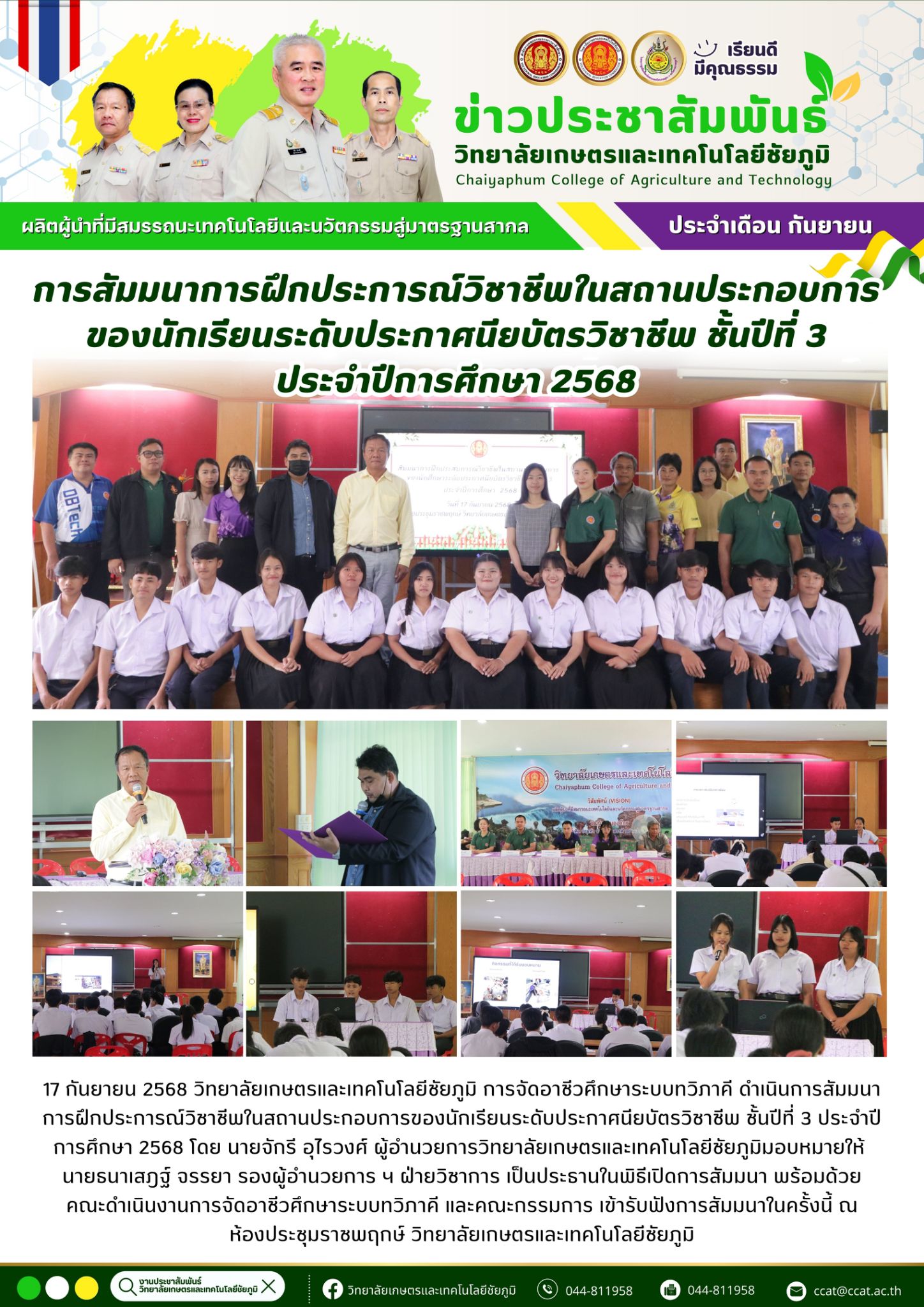 การสัมมนาการฝึกประการณ์วิชาชีพในสถานประกอบการของนักเรียนระดับประกาศนียบัตรวิชาชีพ ชั้นปีที่ 3 ประจำปีการศึกษา 2568 17 ก.ย. 256823 ก.ย. 2025admin siteกิจกรรมภายใน