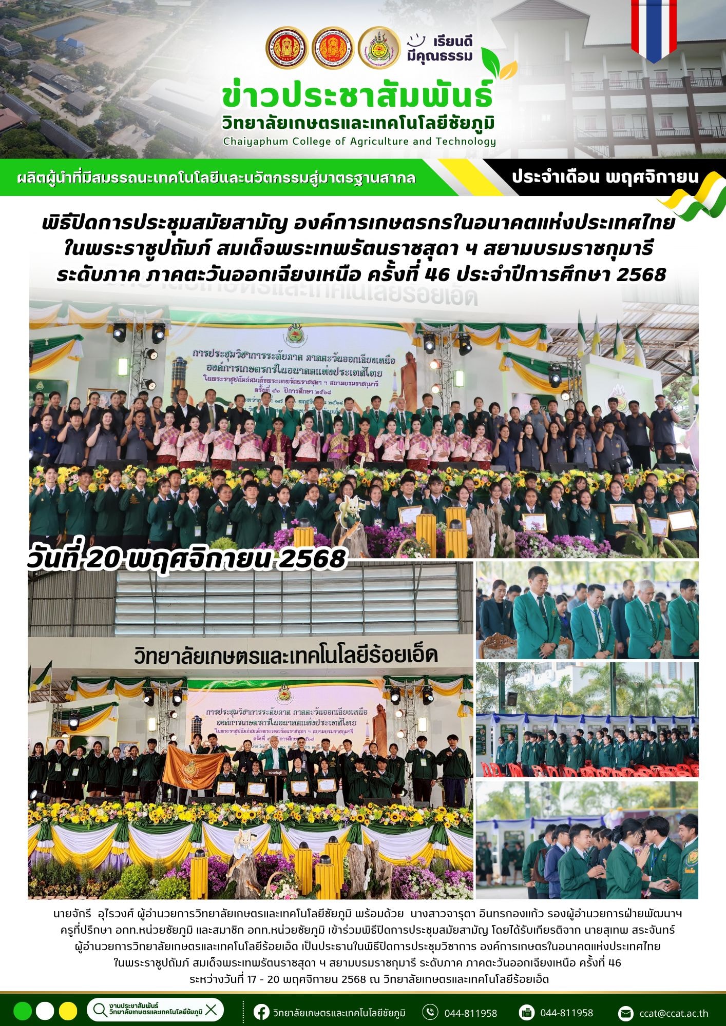 พิธีปิดการประชุมสมัยสามัญ องค์การเกษตรกรในอนาคตแห่งประเทศไทย ในพระราชูปถัมภ์ สมเด็จพระเทพรัตนราชสุดา ฯ สยามบรมราชกุมารี ระดับภาค ภาคตะวันออกเฉียงเหนือ ครั้งที่ 46 ประจำปีการศึกษา 2568 21 พ.ย. 256826 พ.ย. 2025admin siteกิจกรรมภายใน, อกท