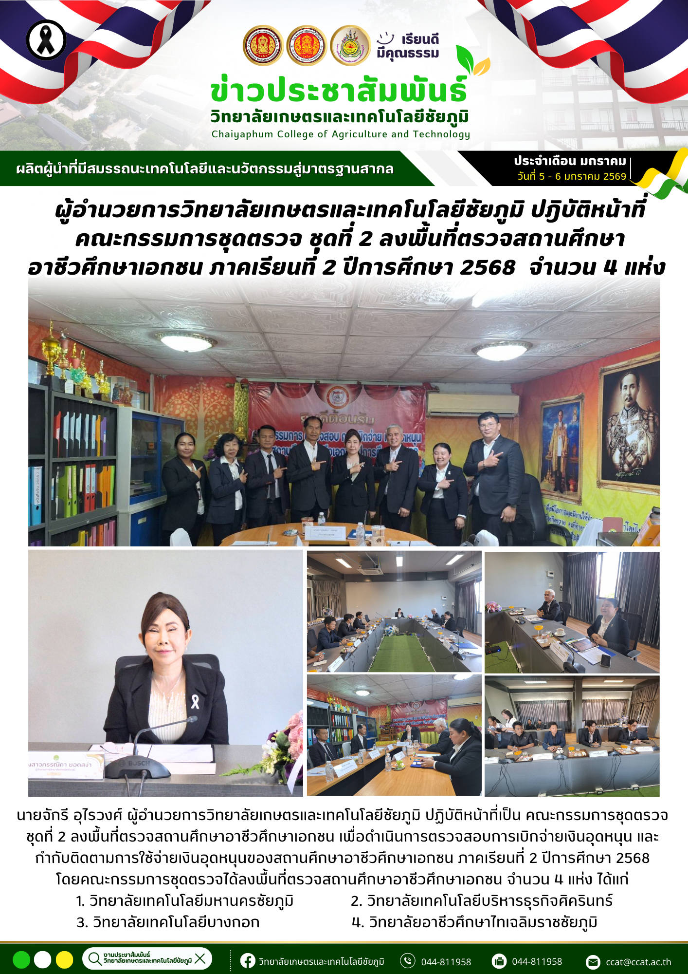 นายจักรี อุไรวงศ์ ผู้อำนวยการวิทยาลัยเกษตรและและเทคโนโลยีชัยภูมิ ปฏิบัติหน้าที่เป็น คณะกรรมการชุดตรวจ ชุดที่ 2 ลงพื้นที่ตรวจสถานศึกษาอาชีวศึกษาเอกชน เพื่อดำเนินการตรวจสอบการเบิกจ่ายเงินอุดหนุน และ กำกับติดตามการใช้จ่ายเงินอุดหนุนของสถานศึกษาอาชีวศึกษาเอกชน ภาคเรียนที่ 2 ปีการศึกษา 2568 6 ม.ค. 25699 ม.ค. 2026admin siteกิจกรรมภายใน