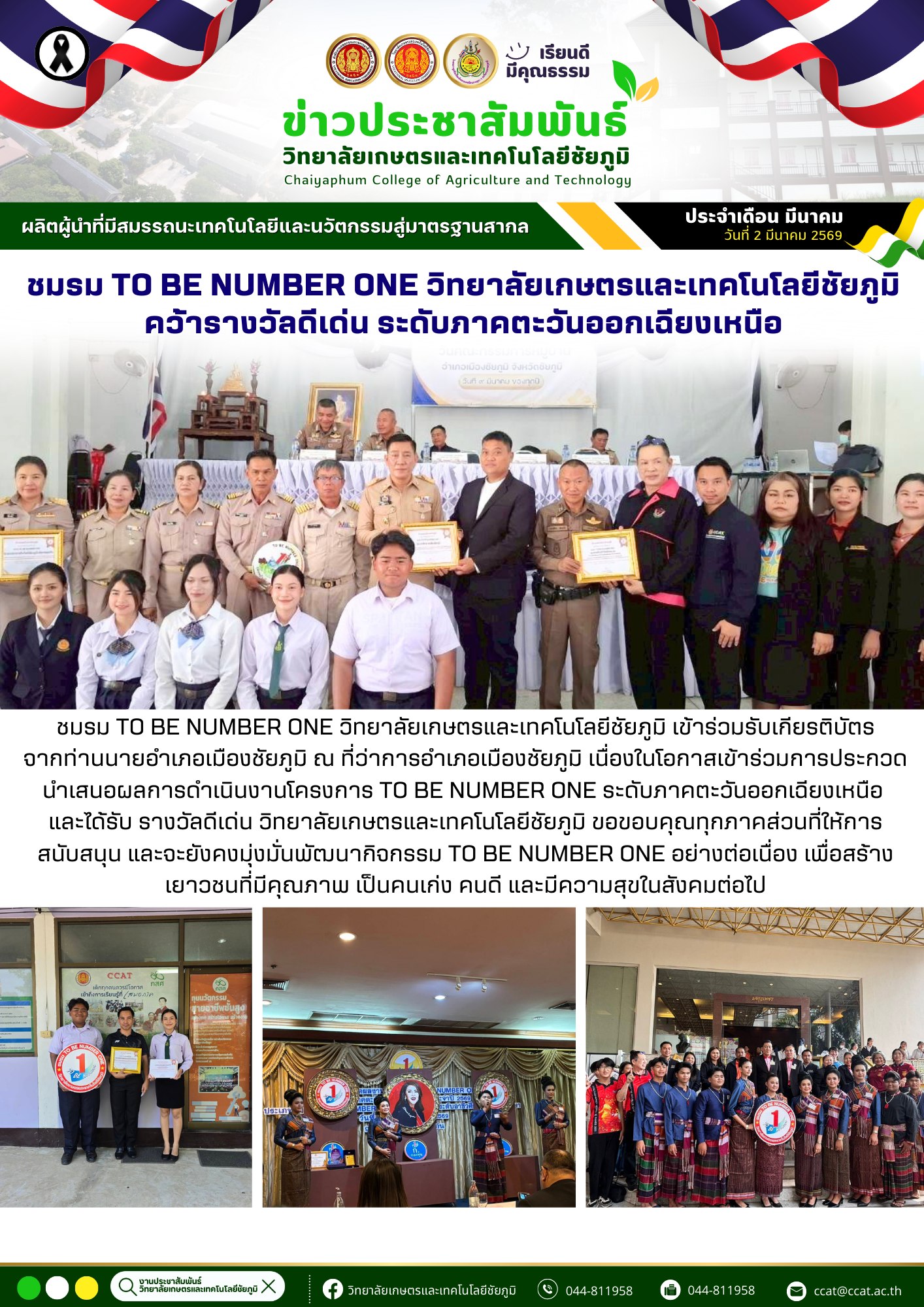 ชมรม TO BE NUMBER ONE วิทยาลัยเกษตรและเทคโนโลยีชัยภูมิ เข้าร่วมรับเกียรติบัตร จากท่านนายอำเภอเมืองชัยภูมิ 5 มี.ค. 2569admin siteกิจกรรมภายใน