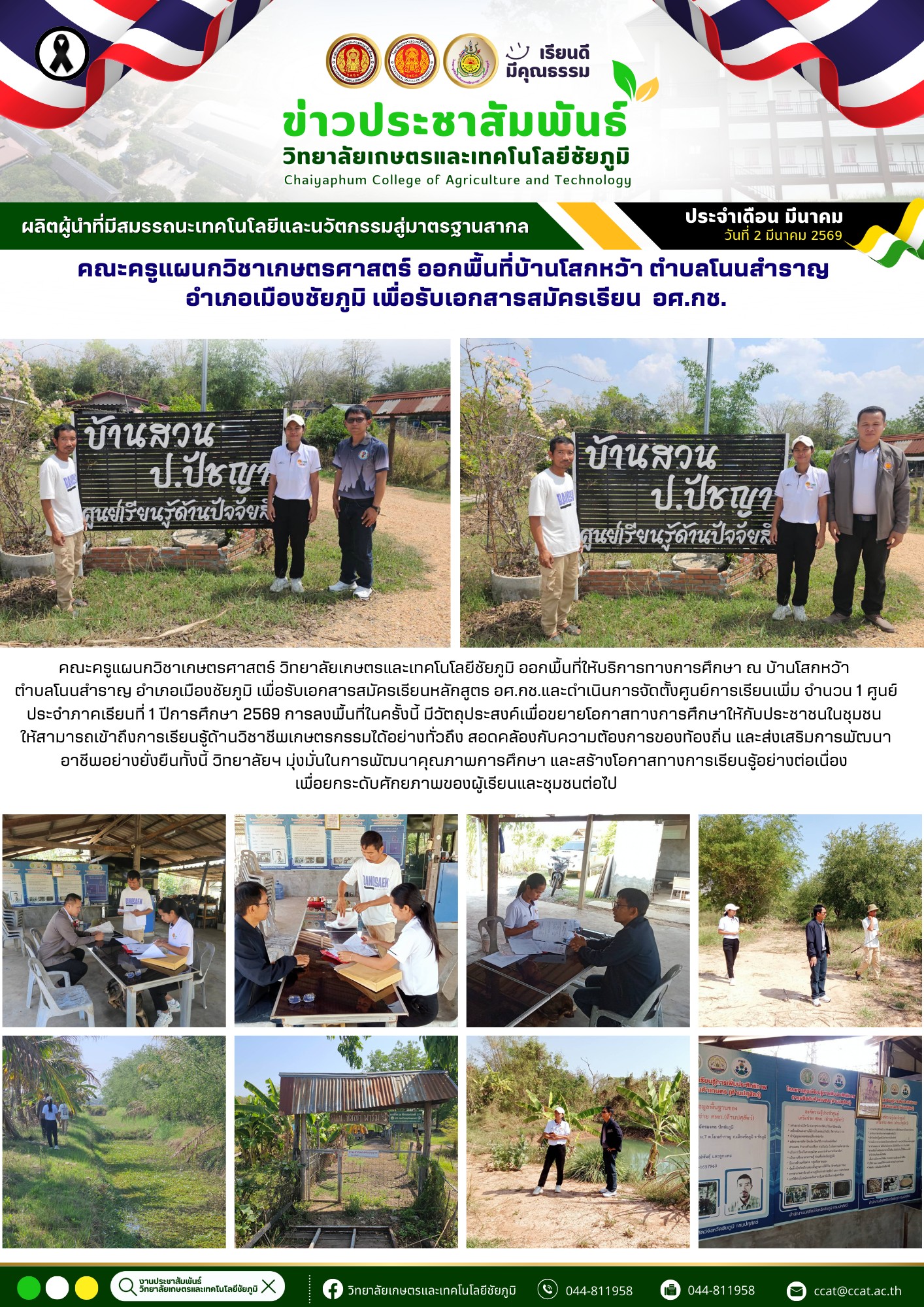 คณะครูแผนกวิชาเกษตรศาสตร์ วิทยาลัยเกษตรและเทคโนโลยีชัยภูมิ ออกพื้นที่ให้บริการทางการศึกษา ณ บ้านโสกหว้า ตำบลโนนสำราญ อำเภอเมืองชัยภูมิ เพื่อรับเอกสารสมัครเรียนหลักสูตร อศ.กช.และดำเนินการจัดตั้งศูนย์การเรียนเพิ่ม จำนวน 1 ศูนย์ 2 มี.ค. 25695 มี.ค. 2026admin siteกิจกรรมภายใน