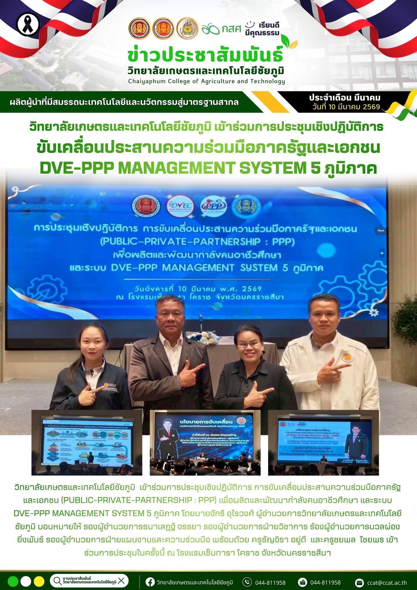 เข้าร่วมการประชุมเชิงปฏิบัติการ ขับเคลื่อนประสานความร่วมมือภาครัฐและเอกชน DVE-PPP MANAGEMENT SYSTEM 5 ภูมิภาค 10 มี.ค. 256929 มี.ค. 2026admin siteกิจกรรมภายใน