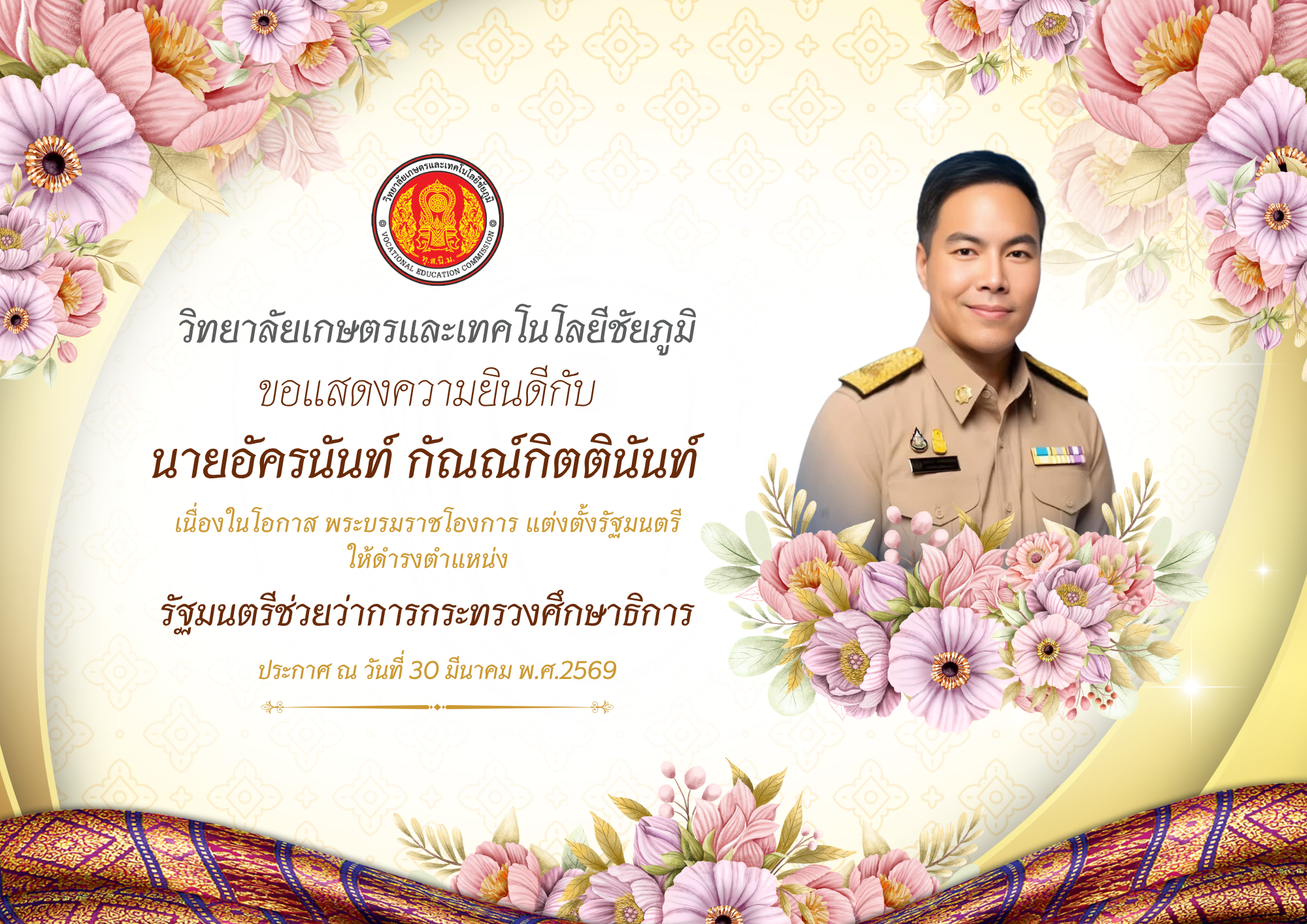 ขอแสดงความยินดีกับ นายอัครนันท์ กัณณ์กิตตินันท์ เนื่องในโอกาส พระบรมราชโองการ แต่งตั้งรัฐมนตรี ให้ดำรงตำแหน่ง รัฐมนตรีช่วยว่าการกระทรวงศึกษาธิการ 31 มี.ค. 2569admin siteข่าวสาร